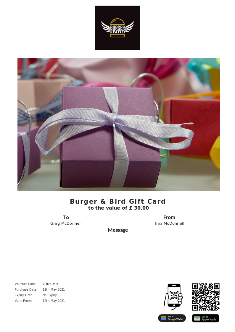 Burger & Bird allows you to purchase instantly printable gift vouchers, special offers and tickets using the Voucher Connect platform.